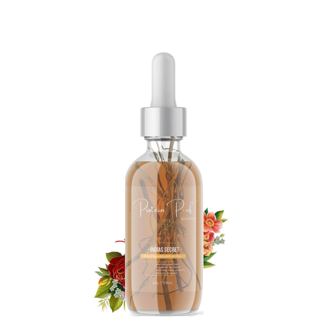 India’s Secret is an intensive all natural herbal oil with over 35 Imported Organic Botanical herbs (RAW Ayurvedic herbs Imported from India) and essential oils that helps stimulate the follicle whilst strengthening and conditioning thinning hair, transforming it to longer, thicker, fuller looking hair. Our proprietary infusion process for this formula takes 7 days before completion.